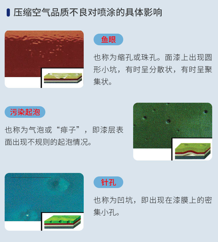在噴涂過程中,壓縮空氣對(duì)涂料的傳輸和霧化起著至關(guān)重要的作用,壓縮空氣和涂料會(huì)直接接觸,所以壓縮空氣的品質(zhì)會(huì)直接影響到最終的涂裝質(zhì)量。