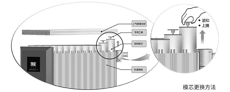 3、獨立的模芯結(jié)構,保證了吸附劑的使用壽命(3~5年一換),模芯更換方便;