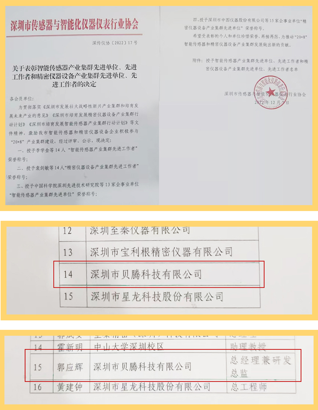 2022年12月7日,由深圳市傳感器與智能化儀器儀表行業(yè)協(xié)會開展的精密儀器設(shè)備產(chǎn)業(yè)集群先進單位評選活動中,深圳市貝騰科技被評為“先進單位”,貝騰科技董事長郭應輝先生榮獲“精密儀器設(shè)備產(chǎn)業(yè)集群先進工作者”稱號。