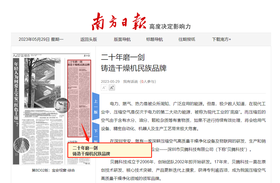南方日報(bào)報(bào)道《貝騰科技:二十年一劍,鑄造干燥機(jī)民族品牌》