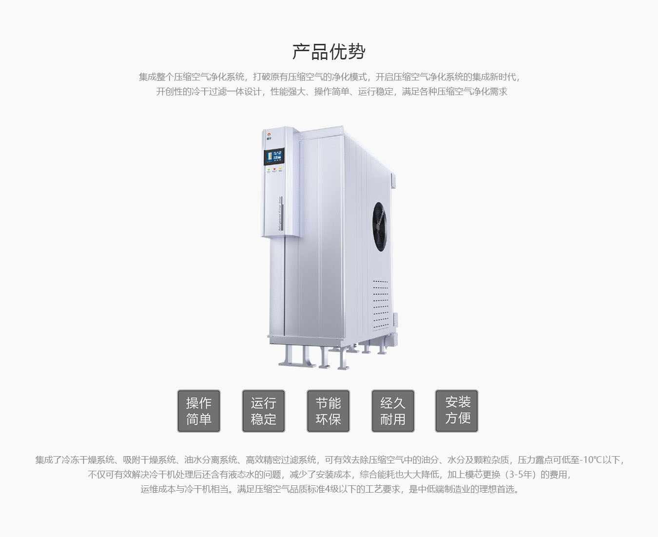 集成整個壓縮空氣凈化系統(tǒng),打破原有壓縮空氣的凈化模式,開啟壓縮空氣凈化系統(tǒng)的集成新時代,開創(chuàng)性的冷干過濾一體設(shè)計,性能強(qiáng)大、操作簡單、運(yùn)行穩(wěn)定,滿足各種壓縮空氣凈化需求。
